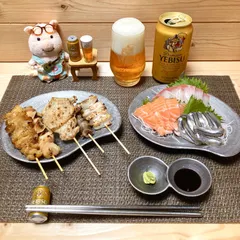 ヱビス🍺 × 🉐¥500→¥350のお刺身盛り合わせ🐟✨ × 焼き鳥✨ 今夜の居酒屋とんちゃん🏮¥500 → ¥350 🉐 お刺身3種盛り合わせ🐟✨焼き鳥 ¥200 × 5 = ¥1000✨焼き鳥は…スーパー前にある小さな焼き鳥屋さんの誘惑に負け…奮発して5本✨🙌とんちゃんにとっては高級焼き鳥です🤭笑きびなごのお刺身が食べたかったのですが、3種類とも超美味でした😍✨🍺昨