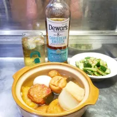 今日は、おでん🍢に海老きゅうり🥒出汁もきれいに取れました🎵合わせるのは、デュワーズ カリビアンスムース8年ハイボールで頂きました。ほんのり甘さがおでんとの相性も良い感じ👍とても食が進みます🎵