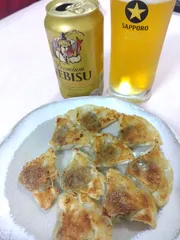 今夜のヱビスのあては、今や大阪名物となった点天のひと口餃子に、こんにゃくの甘辛煮。
