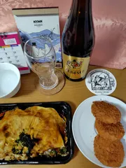 瓶ヱビスは某家電量販店のポイントで入手🍺スーパーで購入したモダン焼きとカニクリームコロッケとともに美味しくいただきました😊右上:YEBISU BREWERY TOKYO受け継ぐ者のコースター左上:去年のヱビス特製カレンダーを再利用♻️
