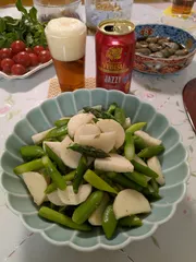 JAZZY✕長芋と春野菜の中華風塩炒め JAZZYで乾杯🍻春野菜が美味しいですね卵を買いにJAさんへ🚗。午後だったので種類も少なくなっていましたが、スナップエンドウとアスパラガス、アイスプラントがあったので一緒に購入スナップエンドウとアスパラは長芋と一緒に炒めて。アイスプラントは湯剥きしたミニトマトとサラダ風にそしていつものスーパーのいつ