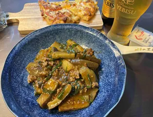 麻婆茄子とヱビス🍺 秋茄子は皮が薄く柔らかで旨みや甘みが強く美味しいです😋