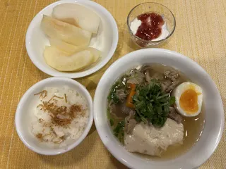 今朝のご飯。またまた肉吸い。 ホタテとちりめんのふりかけ。牛肉🥩と木綿豆腐で肉吸い。ヨーグルト。「秋麗」🍐ラスイチと、「秋月」🍐。  朝食としては十分でしょ。😻
