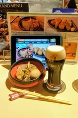 仕事を、終えてアピア店ヘ… ヱビス狂さんおすすめ静岡黒おでん🍢とプレミアムブラック辛子マシマシを戴きました‼️辛子辛すぎて鼻水が…😁トホホ😱🤣ヤー✨🍻🎶🍀