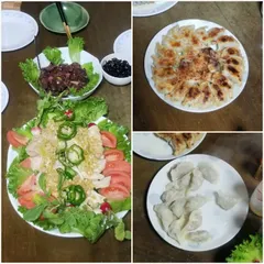 先日は実家にて餃子をたくさん作りました🎵 キクラゲの明太子和え鶏もも肉と鶏むね肉の中華サラダ合挽き肉の焼き餃子豚肉とエビの水餃子 実際の量はこの二皿の3倍くらいです‼️👍