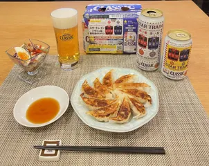手造りではない餃子をサッポロクラシックでいただきました 今日は餃子が出てきました。「これ、造ったの?美味しそうだね」との問いかけに「今日は忙しくて市販の餃子だよ」更に「焼き方が最高でしょ。美味しそうだよ」でした。たまには仕方ないですね😅今回のサッポロクラシックはスタートレインのデザイン缶です。鉄道ファンの方には見逃せないデザインでしょうか。2026年から