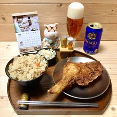 骨付きもも山賊揚げ🍗 × 炊き込みご飯 × プレミアムエール🍺