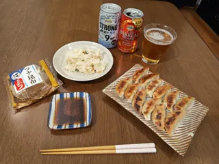 ある日の夕食〈217〉 夫が帰省しているため1人夕食🤭✨️チルドや出来合いのもので済ませました😋🎼餃子(チルド)🥟昔ながらのポテトサラダ🥔🥒🥕ツナ昆布おにぎり🍙お酒はトップバリュの『バーリアルグラン』と『STRONG無糖ドライ』🍺🥛