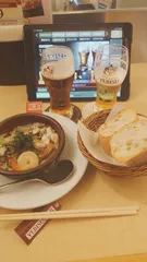 重要なことに気がつきました! いつも、いろいろ飲みたいのと、飲み方がゆっくりなのでぬるくなってしまうのでグラスを頼んでいたのですが、普段、半額にならないジョッキがお得!?と気がつきましたσ(^_^;)ブラックはジョッキにチャレンジ🍺