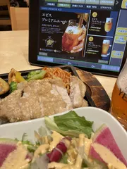 当店限定メニューが楽しみ! 大宮まで出る用事があったので「さいたま新都心にYEBISU BARがあったはず」と来ました。お店独自の「当店限定メニュー」を楽しみに行ったら、なんと!サイボクのゴールデンポークを使ったメニューがあったので「ヒレ串カツ」を注文、1本350円、美味しくて3本くらい食べたかったけど、他にも頼みたいのでガマ