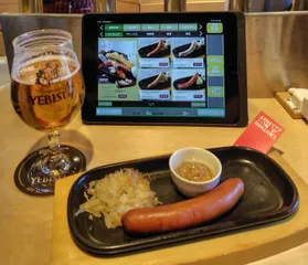 YEBISU BAR エミオ石神井公園店🚃このソーセージは初めて、山形「あら太」黄金肉汁ソーセージ、塩味は薄めでガーリック味強め😲ゴールド&エールなどと共に🍺