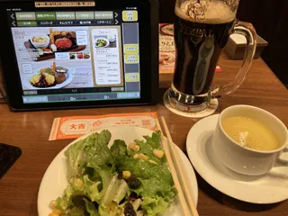 乗り換え駅の銀座ライオンLEOで 3連敗後の勝利まだ見放してはいないのかな 4勝6敗3分 エビスブラック中ジョッキと本日のスープとサラダセット(ランチメニューじゃないの?)で1520円