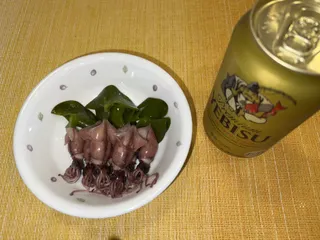 ヱビス🍺 × ホタルイカ🦑 × 炙り下足握り🦑 × キュウリのサラダ 今夜の居酒屋とんちゃん🏮は…、ホタルイカ🦑 ¥375 → ¥187✨炙り下足握り🦑 ¥537 → ¥375✨きゅうりは、知人の家庭菜園で採れたそうで…🥒タダでいただきました🤣笑 プライスレス🤭笑 あ、シーチキン代はかかってますね😛美味しくいただきました😊✨