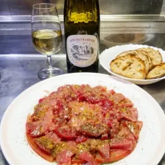 NEW 🍅まぐろのカルパッチョ🍅 まぐろのカルパッチョとトマト🍅🐟フィンガーライムを散らしました。まぐろは脂の多い所だったのでちょっとくどいですが、柑橘の酸味が良い仕事をしてくれます。 ワインは、ポールマスLa Forge Estate Gewürztraminer 2023樽熟成で風味たっぷりどっしり目のゲヴェルツ。春の