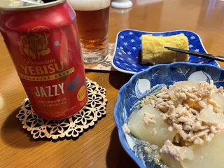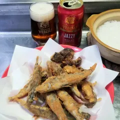 今日はメヒカリのから揚げ、鮭の氷頭なますで飲みました。 メヒカリは頭も内臓もそのままに揚げたので、苦い所もありますが、そこにヱビスJazzyの香ばしさが良く合いました。🍺👍椎茸も少しあったので揚げました。 氷頭なますは柚子で仕上げ。こちらはプレモル優美な余韻で。ビールのほんのり柑